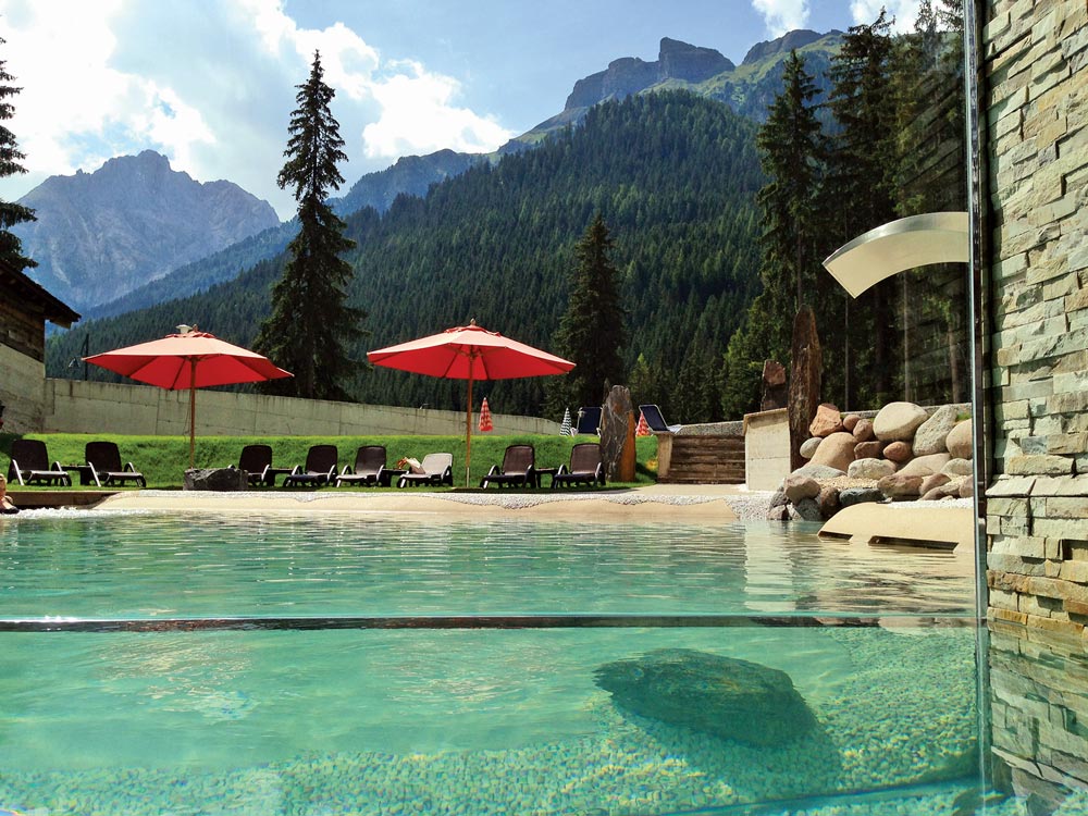 Un paraíso natural, donde el arquitecto estrella Sorapera del Trentino y el director gerente del Hotel, Erik Detone, han decidido crear un proyecto de piscina perfectamente integrado en el paisaje y, al mismo tiempo, altamente tecnológico. Así nace una piscina Biodesign que comienza dentro del Spa, entre monolitos, zonas para niños y asientos sumergidos y está separada de la parte exterior por un gran ventanal que ofrece a los bañistas cómodos bancos para aeroterapia con una vista maravillosa que se asoma sobre las Dolomitas. Para evitar dispersiones térmicas, se ha instalado una puerta de cristal automática dentro de la piscina que se acciona cuando pasan los bañistas. La piscina exterior está compuesta por dos piscinas, una más alta y pequeña que vierte las aguas en la piscina grande a través de una cascada que se puede temporizar mediante sistemas de filtración completamente independientes. La piscina de abajo es calefactada y, por ello, se aplica una cubierta integrada en el suelo que permite un cierre completo de la piscina durante la noche.