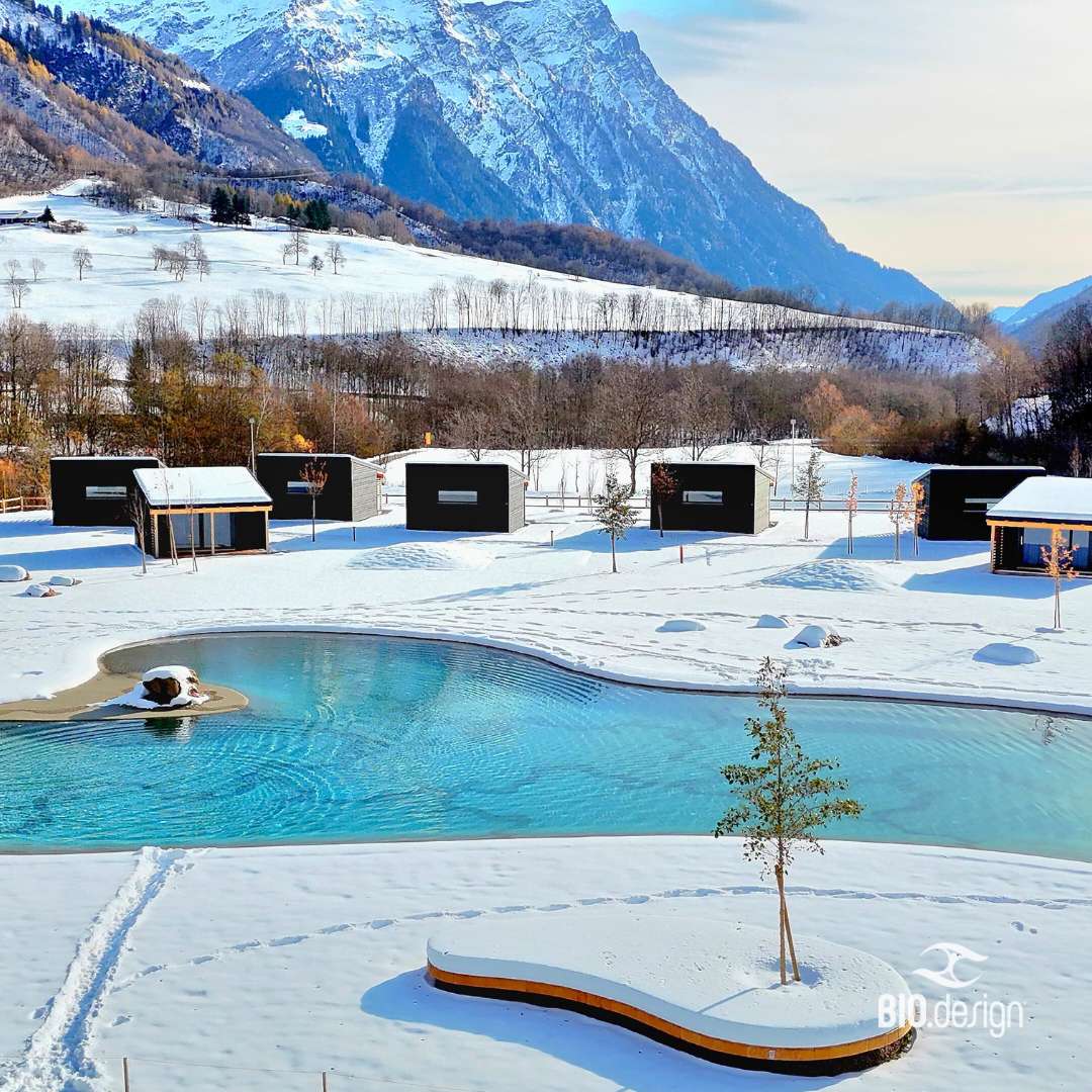 Las piscinas tipo playa Bio.design son, en todas las estaciones, incluso en las más duras, un bello elemento de decoración para su jardín.